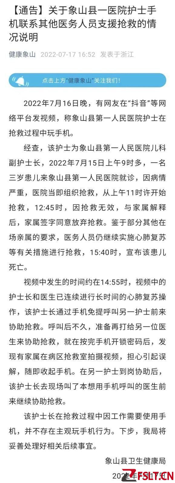 随后,浙江宁波市象山县卫生健康局17日发布情况说明,7月16日晚,有网友在“抖音”等网络平台发视频,称象山县第一人民医院护士在抢救过程中玩手机。