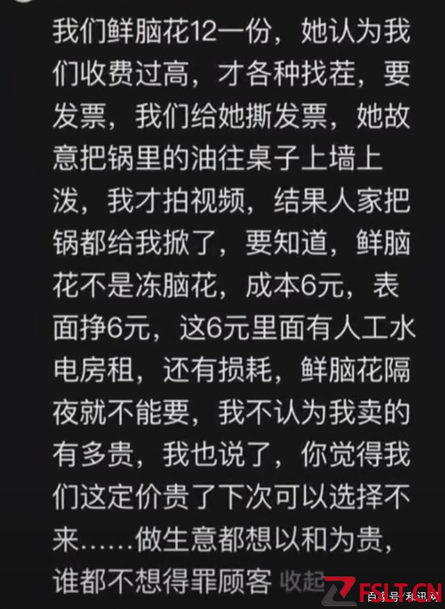赵女士说,“鲜脑花不比冻脑花隔夜仍可用,店里6元一份进货,搭配生菜出售,算上人工、场地、水电等各种成本,卖12元一份也算是正常。没必要为此掀翻火锅,烫到人了怎么办?炉火爆燃也很危险。”
