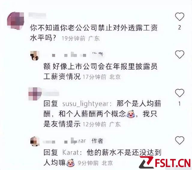 评论区有其他网友提醒称:“你不知道你老公公司禁止对外透露工资水平吗?”该女子回复:好像上市公司会在年报里披露员工工资情况,并吐槽:“他的薪水不是还没达到人均嘛”。