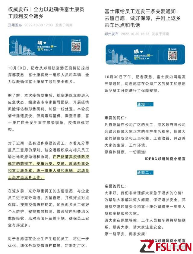 10月30日下午,“郑州发布”连发两条消息,通告“富士康给员工连发三条关爱通知:去留自愿,做好保障,并附上返乡乘车地点和电话”,“全力以赴确保富士康员工顺利安全返乡”。