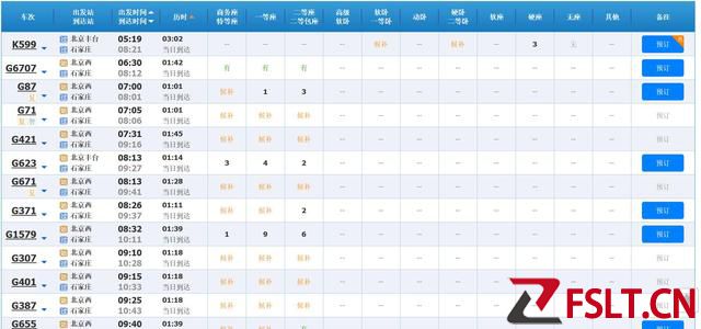 12月30日北京-石家庄部分余票情况截图。来源:12306网站