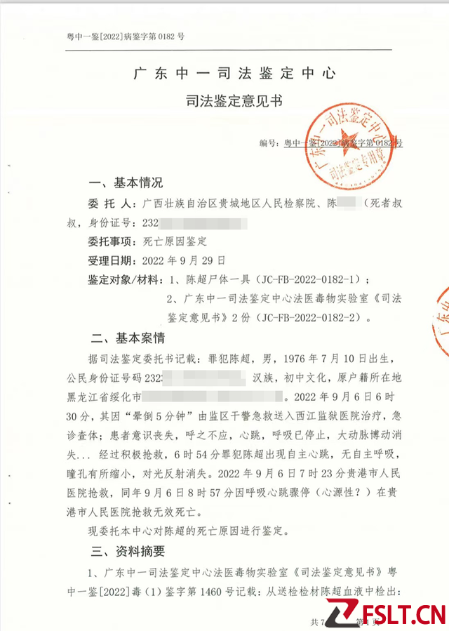 司法鉴定显示,陈超系外力作用(如扼颈、捂口鼻)致机械性窒息死亡。2022年10月,广东中一司法鉴定中心出具鉴定意见书。该鉴定意见书在“基本案情”中写道,“2022年9月6日6时30分,其(指陈超)因‘晕倒5分钟’由监区干警急救送入西江监狱医院治疗,急诊查体;患者意识丧失,呼之不应,心跳,呼吸已停止,大动脉博动消失.。经过积极抢救,6时54分罪犯陈超出现自主心跳,无自主呼吸,瞳孔有所缩小,对光反射消失。7时23分贵港市人民医院抢救,8时57分因呼吸心跳骤停(心源性?)在贵港市人民医院抢救无效死亡。”鉴定意见书显示,陈超系外力作用(如扼颈、捂口鼻)致机械性窒息死亡。