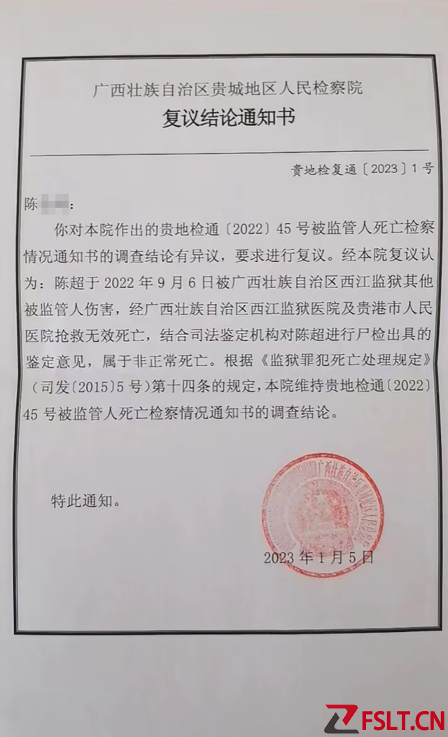 同年10月,贵城地区检察院出具《被监管人死亡检察情况通知书》显示,陈超于2022年9月6日被西江监狱其他被监管人伤害,经西江监狱医院以及贵港市人民医院抢救无效死亡,属于非正常死亡。