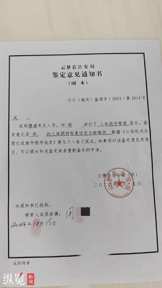 云梦县公安局向周女士出具的鉴定意见书。(来源/受访者提供)