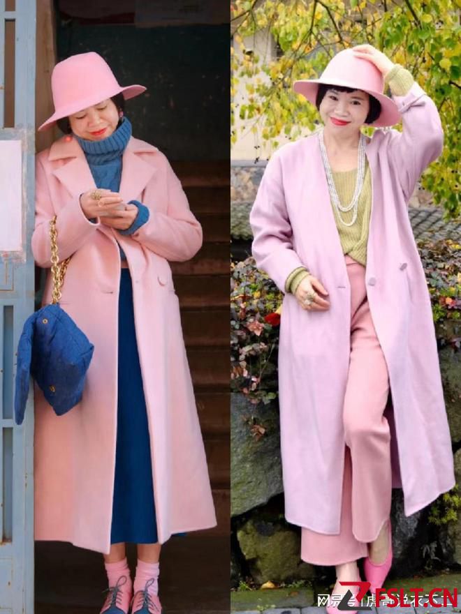 浅粉色系不仅适合老年人,中年女人也可以大胆尝试,看看博主生活在别处,选择浅粉色呢子长大衣,不仅显得肤色白皙,整个人也能变年轻很多。