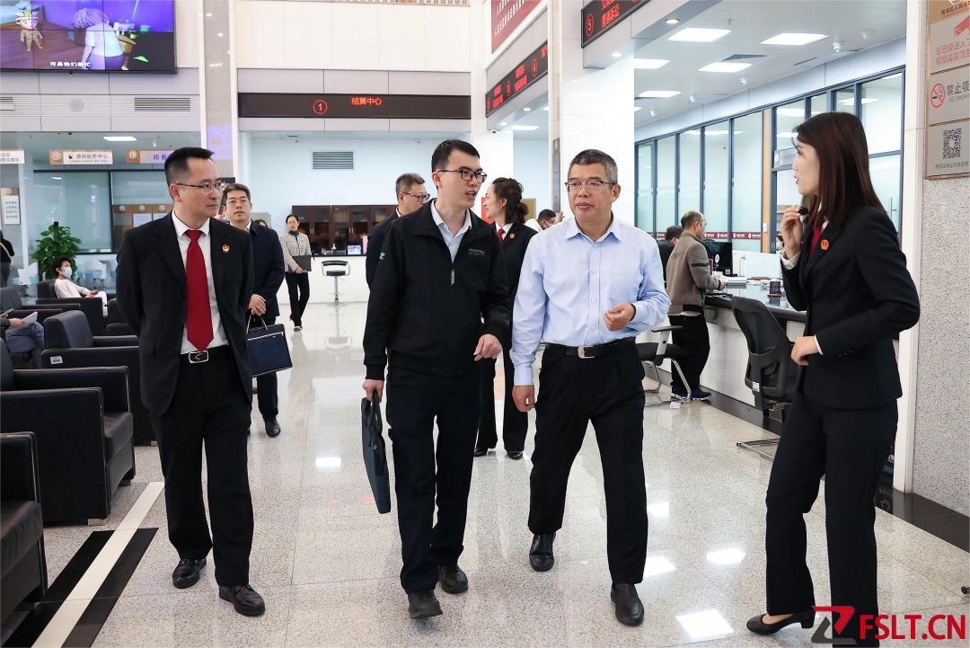 图为苏荣欢(左二)在佛山市南海区法院诉讼服务中心了解一站式建设工作。