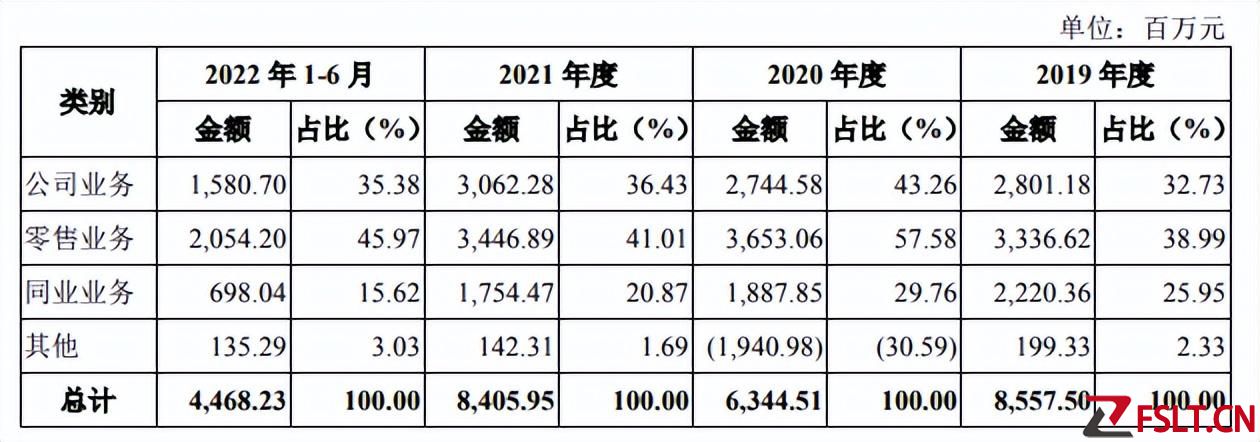 招股书显示,2019年至2022年上半年,顺德农商行的零售业务收入分别为33.37亿元、36.53亿元、34.47亿元及20.54亿元,在营收中的占比分别为38.99%、57.58%、41.01%、45.97%。