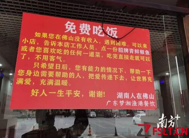 “如果您在佛山没有收入,遇到困难,可以来小店,告诉本店工作人员,点一份招牌青鲜椒鱼或者您喜欢吃的任何一道菜,吃完直接走就可以了,不用客气!”