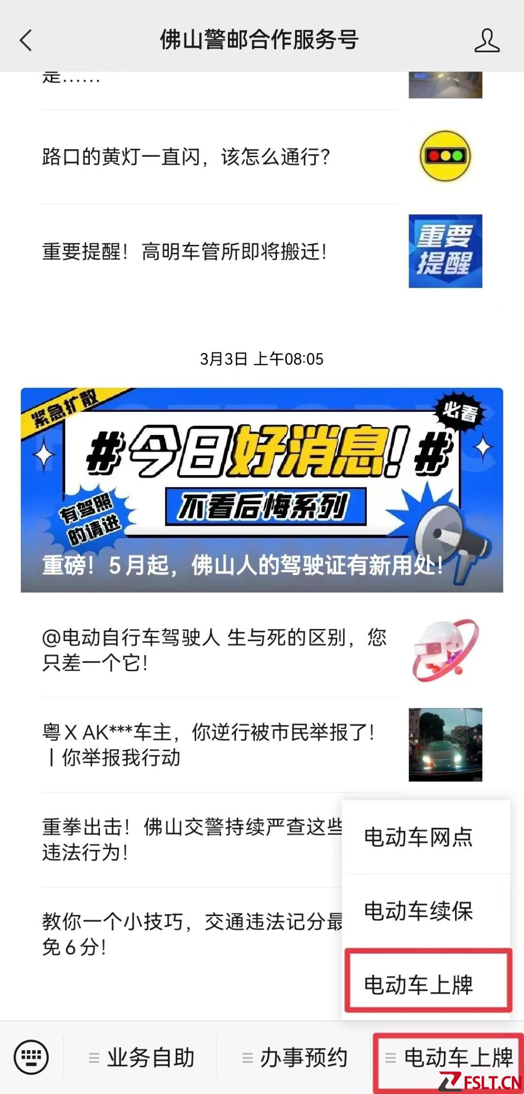 市民群众可以根据自身的实际情况和个人意愿,选择性办理电动自行车意外险微信搜索关注“佛山警邮合作服务号”,进入主页,点击右下角菜单栏中的【电动车上牌】,随后选择【电动车续保】,输入车牌号进入投保/续保流程。