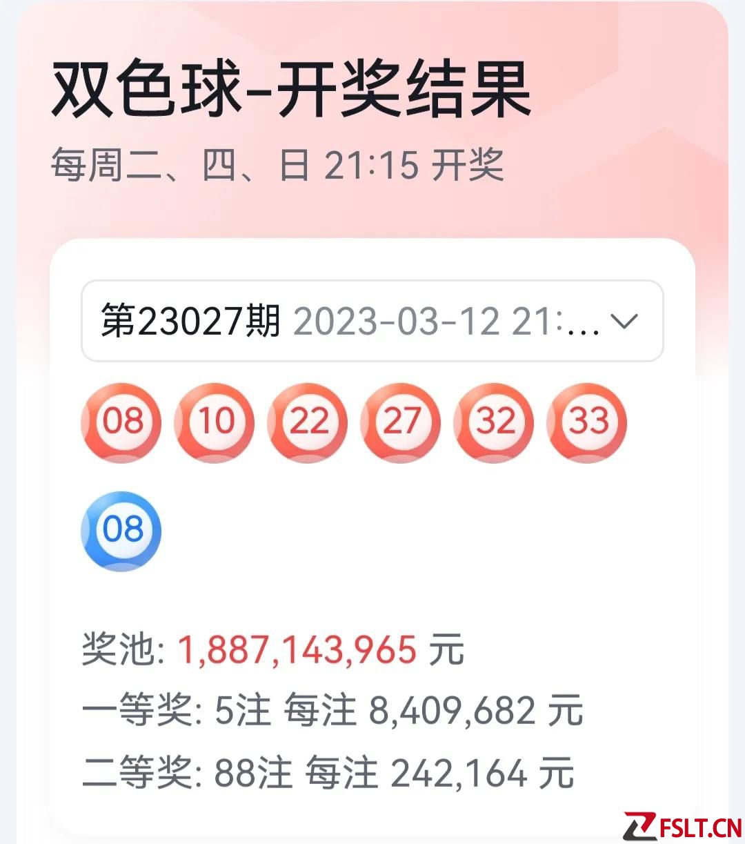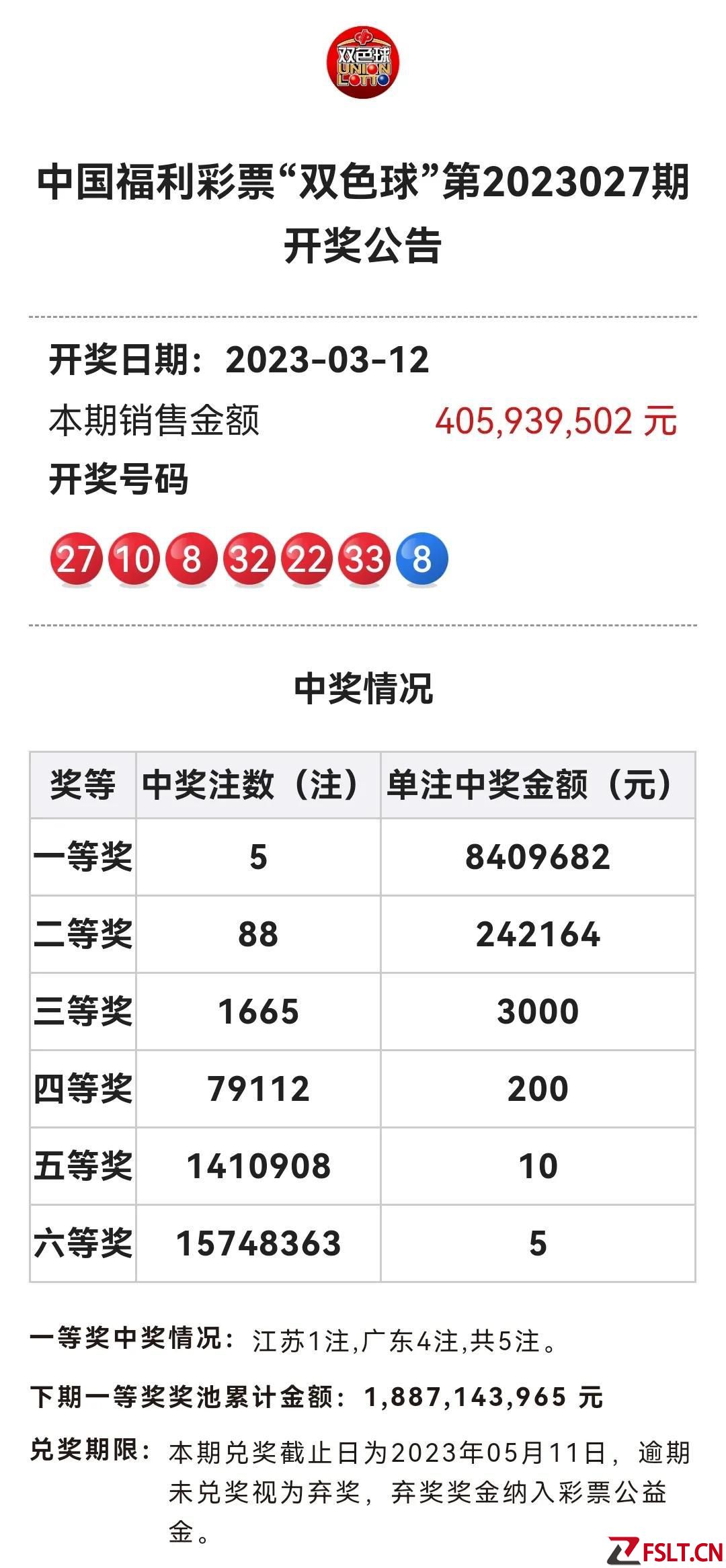 中国福利彩票双色球第23027期于2023年3月12日晚21:15分进行了开奖。