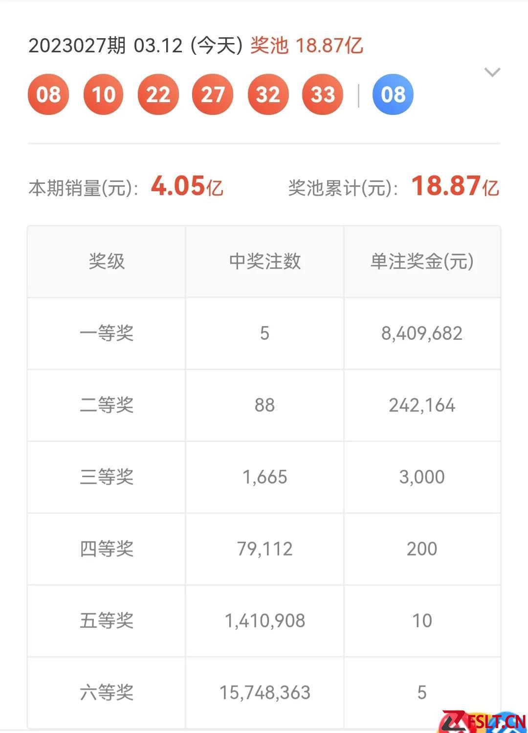 本期的中奖号码是,红球:08,10,22,27,32,33,蓝球:08。