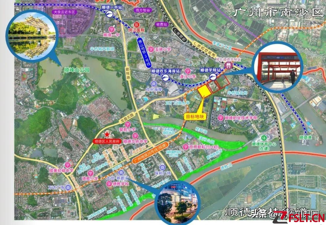 地块紧邻广州地铁7号线顺德西延线美地大道站,可换乘佛山地铁3号线,外加广佛环线轻轨,片区已汇集3条轨道交通。