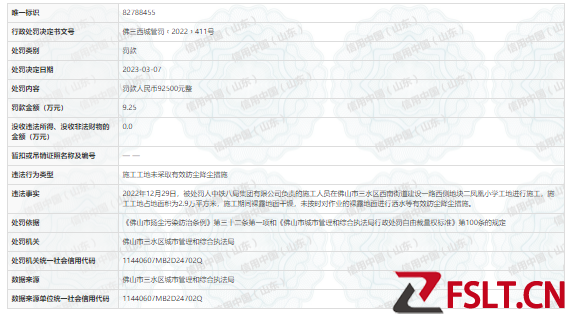 中铁八局集团有限公司因违反佛山市扬尘污染防治条例被罚