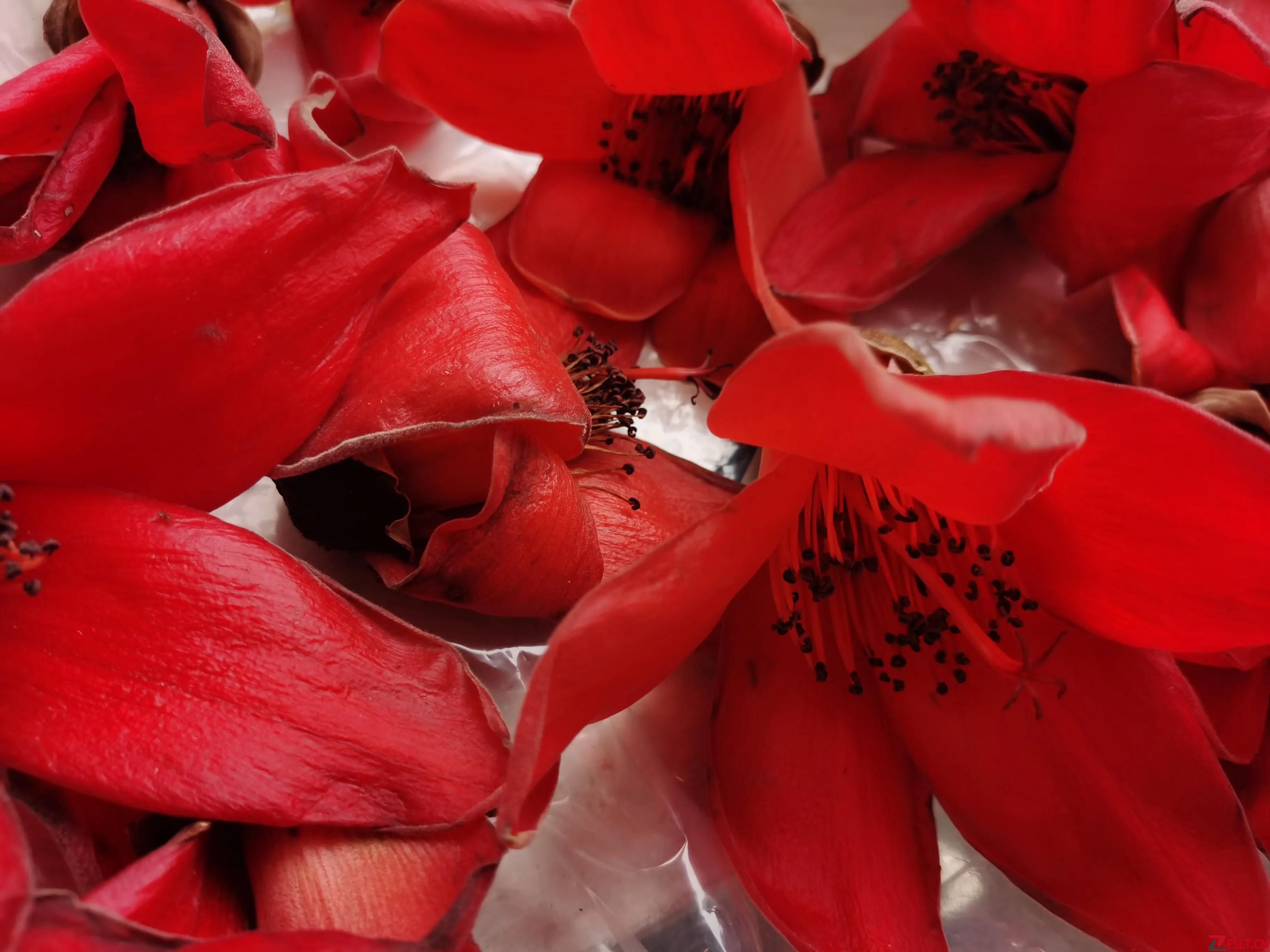 这血红颜色的花,不愧英雄花的名号,确实红似血,降落地面也不枯萎,神奇!我看到有人捡起花朵后,直接原地开始晾晒,据说是拿回家煲祛湿汤喝,我搜了下网页,确实是有些功效介绍,所以,我今天也捡了几朵,还拍了照片。