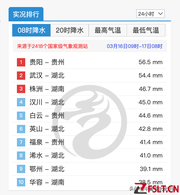 像是中央气象台的24小时降水排行榜上可见,3月16日-3月17日,长江流域雨下整夜,省会城市中贵阳、武汉位居全国降水前两名,并且两个城市气象站24小时降雨量都超过了50毫米,达到了暴雨级别,这也是这两个城市今年以来的首场暴雨。