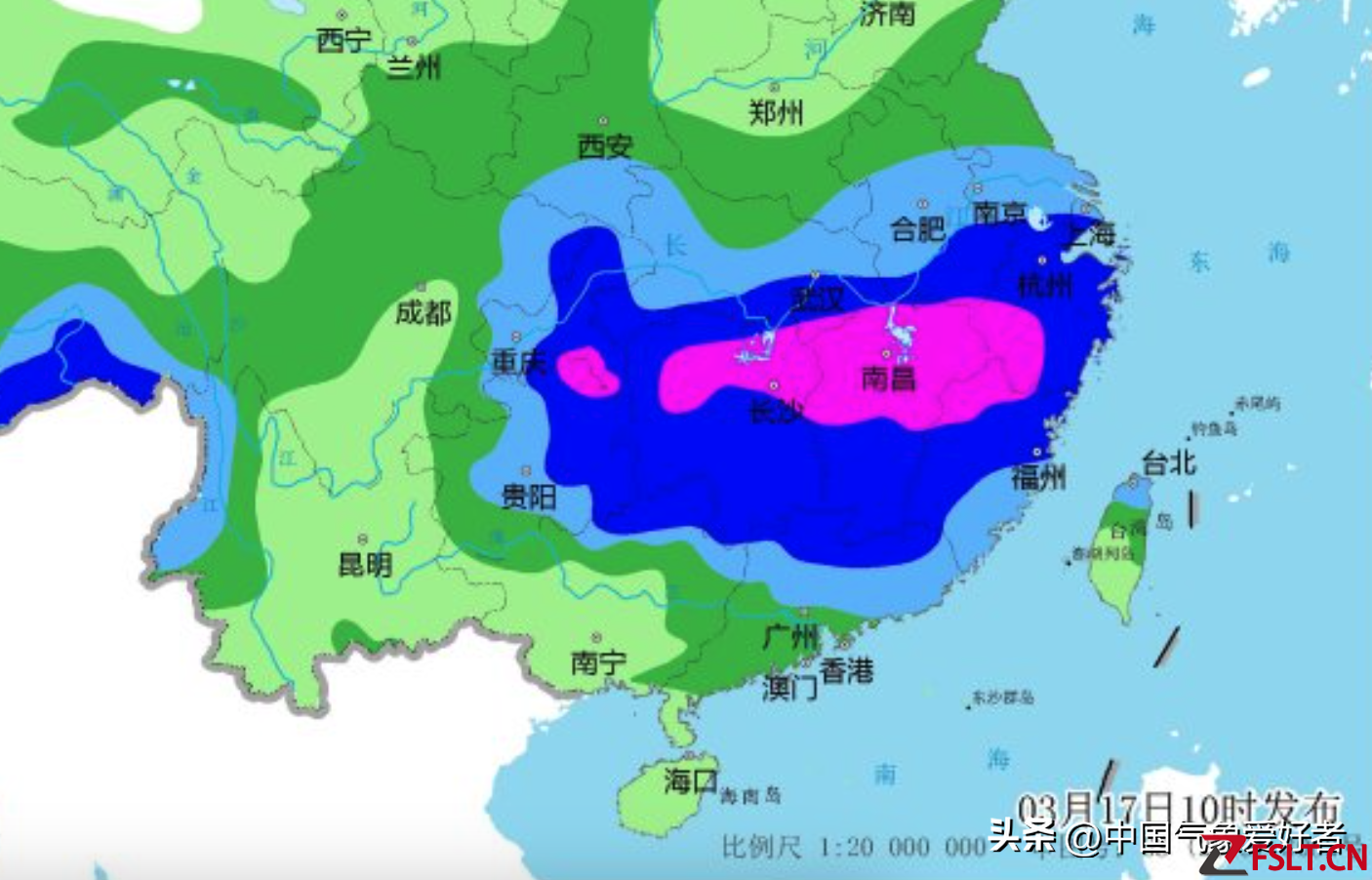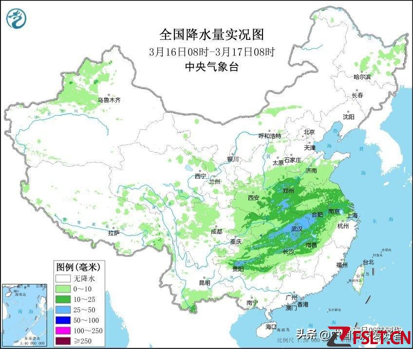 暴雨来了!3月16日-3月17日,在我国北方多地大雪纷飞之际,暖湿水汽的增强也让我国南方地区的降雨迅速增强扩大。中央气象台的监测数据显示,3月16日8时-3月17日8时,长江流域大范围的降雨已经展开,从云贵高原到长江口,大范围的出现了中到大雨,局部还出现了暴雨,各地春雷滚滚、贵州局部还下了冰雹。