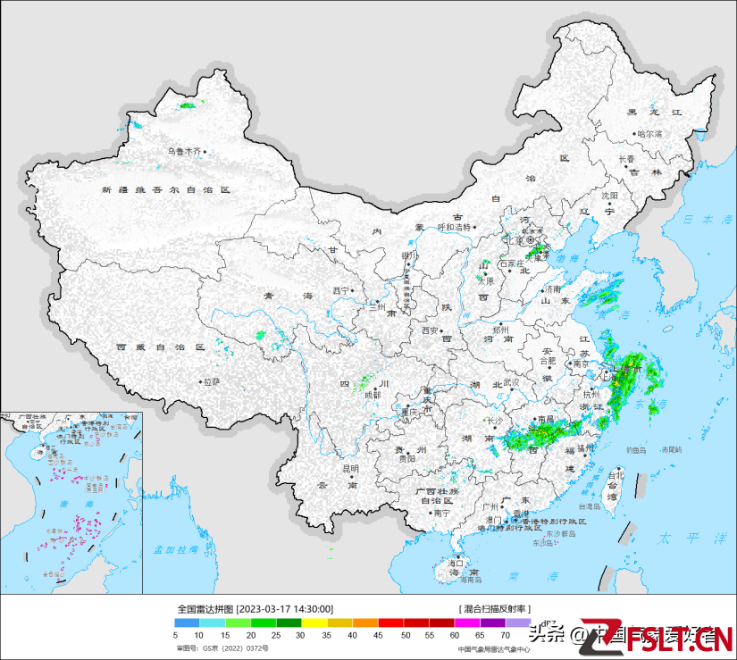 下午14时30分的雷达图上可见,今天下午,我国南方地区的雷达回波带已经来到江西中部和浙江沿海,雷达回波强度已经显著减弱,这意味着,这两天发展起来的大范围降雨天气已经开始减弱,本轮强降雨即将暂告一段落。
