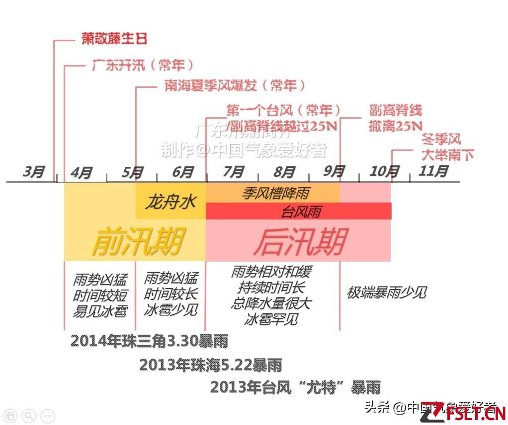 事实上,从往年气象观测数据上看,广东省会在3月底4月初入汛,平均入汛时间是4月6号。广东省的汛期很长,一般到10月中旬汛期才结束,其间暴雨繁多,灾害频仍,但各阶段表现特点并不一样。根据环流形势、暴雨成因、暴雨特点的不同,广东的汛期可分为前汛期、后汛期两段——简单化一点,划分前汛期和后汛期的标准就一条:看副热带高压脊线是不是越过了广东省,副高北边的汛期是前汛期,副高南边的汛期是后汛期,关键的时间节点是6月底7月初。