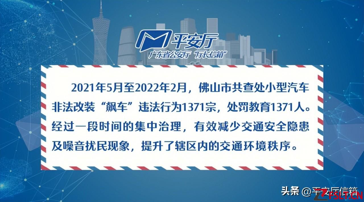 据统计,2021年5月至2022年2月,佛山全市共查处小型汽车非法改装“飙车”违法行为1371宗,处罚教育1371人,有效减少交通安全隐患及噪音扰民现象,提升了交通环境秩序,得到群众的点赞。