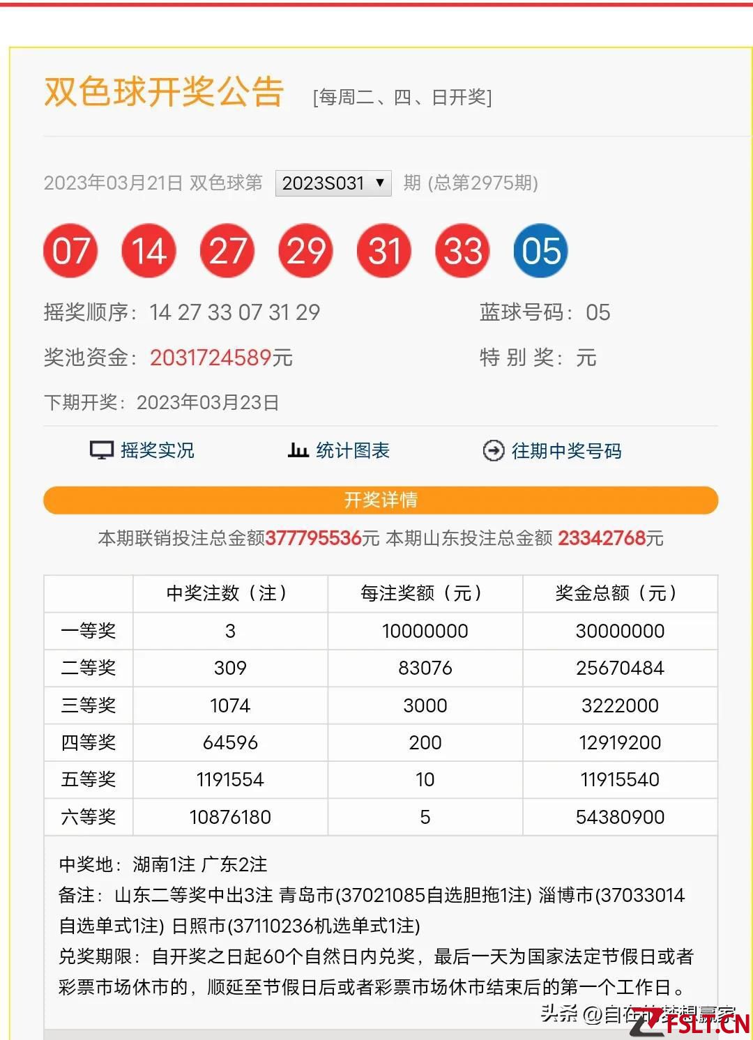 #从今天起记录我的2023# 3月21日,双色球第23031期开奖,广东佛山彩民李先生,一人独揽217注双色球二等奖以及357注四等奖,共计获得奖金1809万多元。仅仅一个蓝球号码之差,遗憾错失了217注一等奖,与10.8亿元大奖擦肩而过!