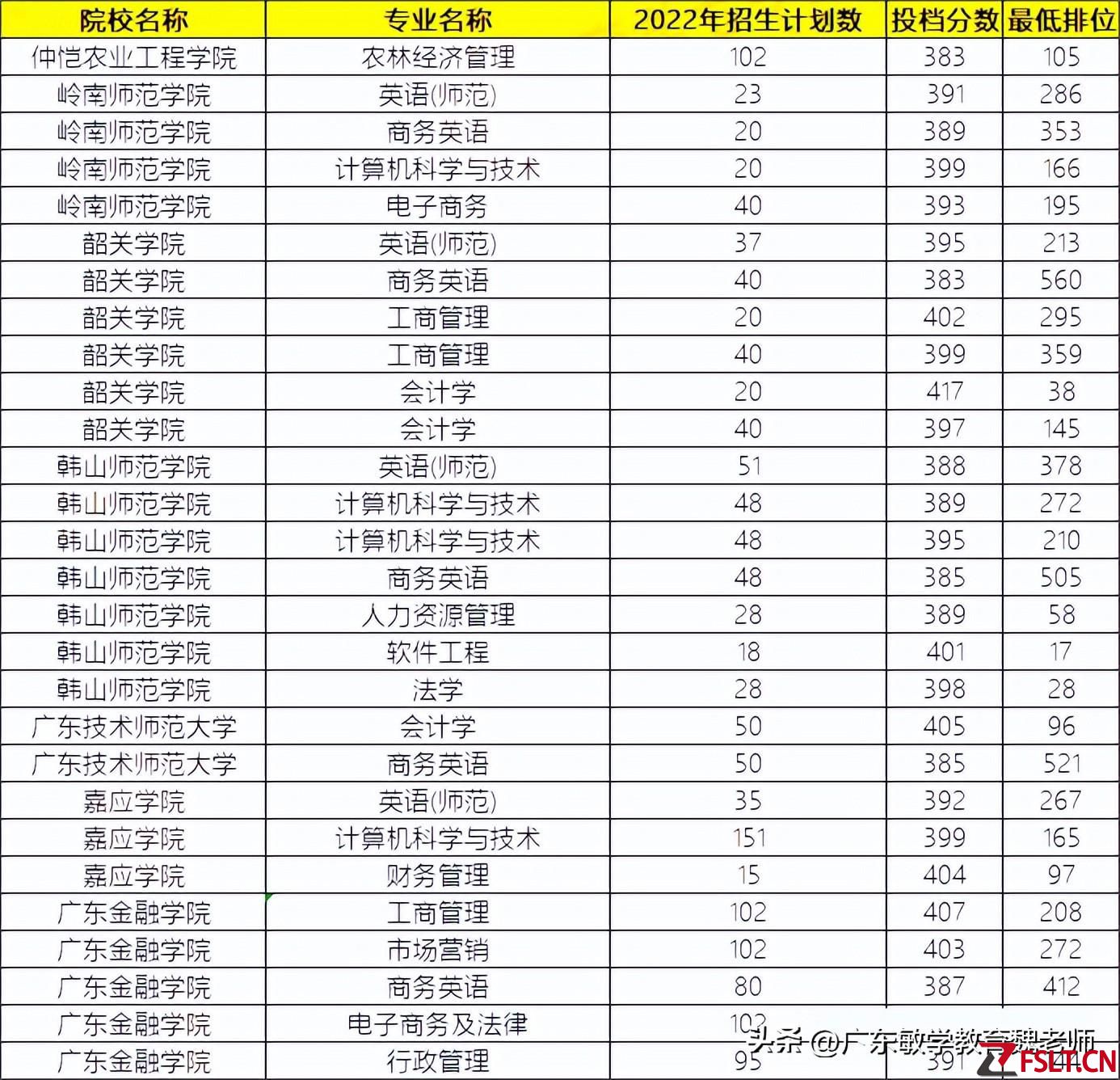 高于380分的都是热门专业,大部分为师范类、管理类专业,也有少数计算机类专业,最卷的是韶关学院的会计学专业,要417分,最低排位38。