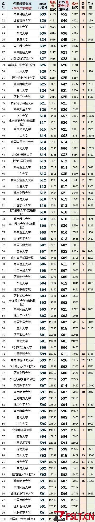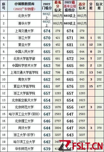广东省2022年物理类录取分数最高的25所985大学分数线(位次)