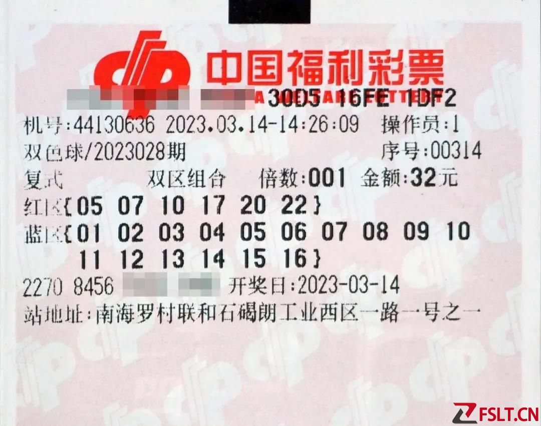 据媒体报道,在福彩双色球游戏第23028期开奖中,当期全国共开出了4注一等奖,单注奖金为1000万元,广东省佛山市南海区罗村联和石碣朗工业西区1路1号之1的福彩站中出了1注大奖,中奖彩票是一张32元投入的6+16蓝区全包复式票,此票击中了当期16注大奖(1注头奖和15注二等奖),中得奖金累计1308万余元。