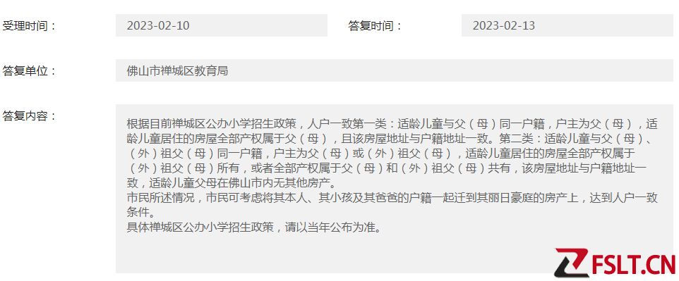 禅城区教育局:根据目前禅城区公办小学招生政策,人户一致第一类:适龄儿童与父(母)同一户籍,户主为父(母),适龄儿童居住的房屋全部产权属于父(母),且该房屋地址与户籍地址一致。