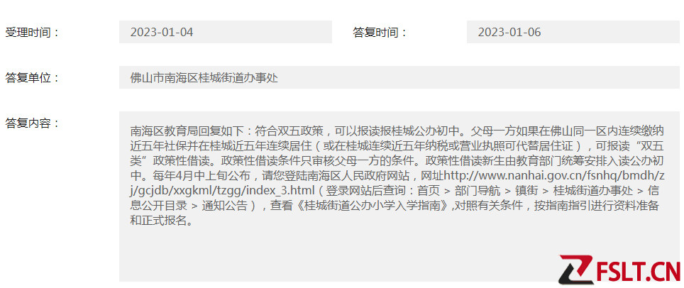 南海区教育局回复如下:符合双五政策,可以报读报桂城公办初中。父母一方如果在佛山同一区内连续缴纳近五年社保并在桂城近五年连续居住(或在桂城连续近五年纳税或营业执照可代替居住证),可报读“双五类”政策性借读。政策性借读条件只审核父母一方的条件。政策性借读新生由教育部门统筹安排入读公办初中。每年4月中上旬公布。