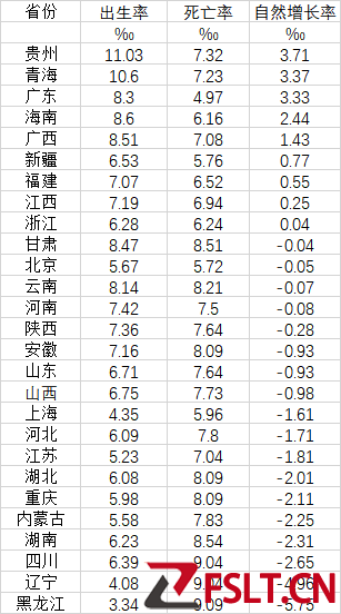 从出生率来看,27个省份中,有12个省份人口出生率超过7‰,这12个省份也超过了6.77‰的全国平均水平。12个省份中,有9个省份来自中西部,只有海南、广东和福建来自东部沿海。