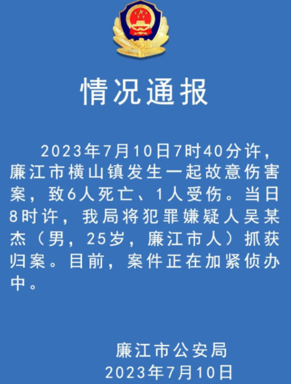 近日,广东省廉江市发生一起令人震惊的恶性刑事案件,导致六人死亡,一人受伤。