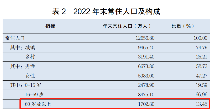 根据《2022年广东国民经济和社会发展统计公报》:2022 年末,全省常住人口 12656 万人,其中城镇常住人口 9465万人,占比74.79%。60岁及以上人口为1702万人,占13.45%。从上述数据中可以推测:在广东省,每100人当中,60岁及以上的,有13人。