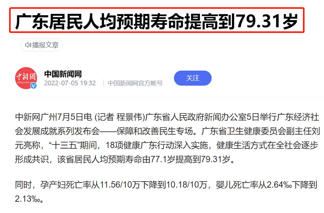 根据广东省卫健委发布的数据显示:十三五期间,广东省开展18项健康广东行动,全省人均预期寿命达到79.31岁。在全国范围内,属于高水平。