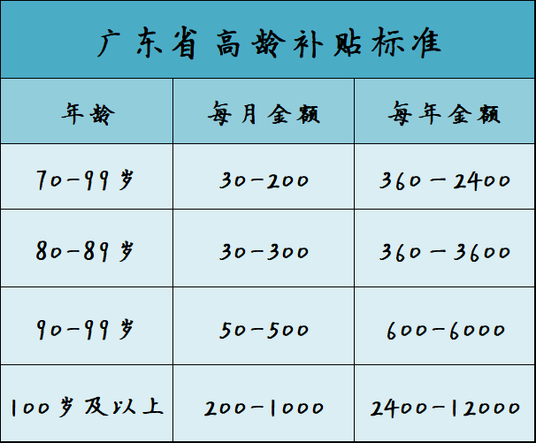 广东省在此基础上,制定了优待老年人的规定,进一步明确高龄津贴发放范围和发放标准,各地可结合当地经济发展状况,调整津贴标准:70~79周岁的老人,每人每年标准为360-2400元;80~89岁的老人,每人每年标准为360-3600元;90~99岁的老人,每人每年标准为600-6000元;100岁以上的,每人每年标准为2400-12000元。