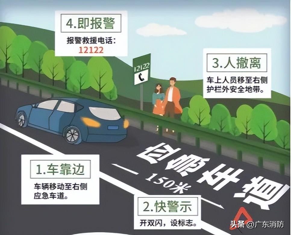 车辆发生事故或故障,谨记“车靠边、快警示、人撤离、即报警”,将车迅速移至右侧应急车道,立即开启危险报警闪光灯,面朝后方观察,在来车方向150米外放置三角警示牌,车上人员迅速转移到护栏外安全地带,拨打110或者12122报警等待救援,切忌在路中争吵、逗留。