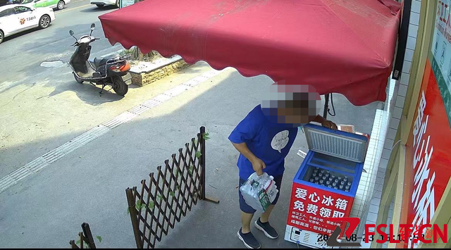 监控画面显示,当晚21点左右,一位白衣男子走到冰柜前,从里面拿了一瓶冰水,咕噜咕噜地喝了一大口,然后回到路边的车上,打开后备箱,从里面提了一箱矿泉水放到爱心冰柜旁边,随后返回车内离开。