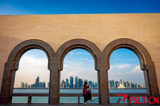 11月11日,卡塔尔多哈,透过伊斯兰艺术博物馆阳台上的拱门远眺多哈的建筑群。图/视觉中国