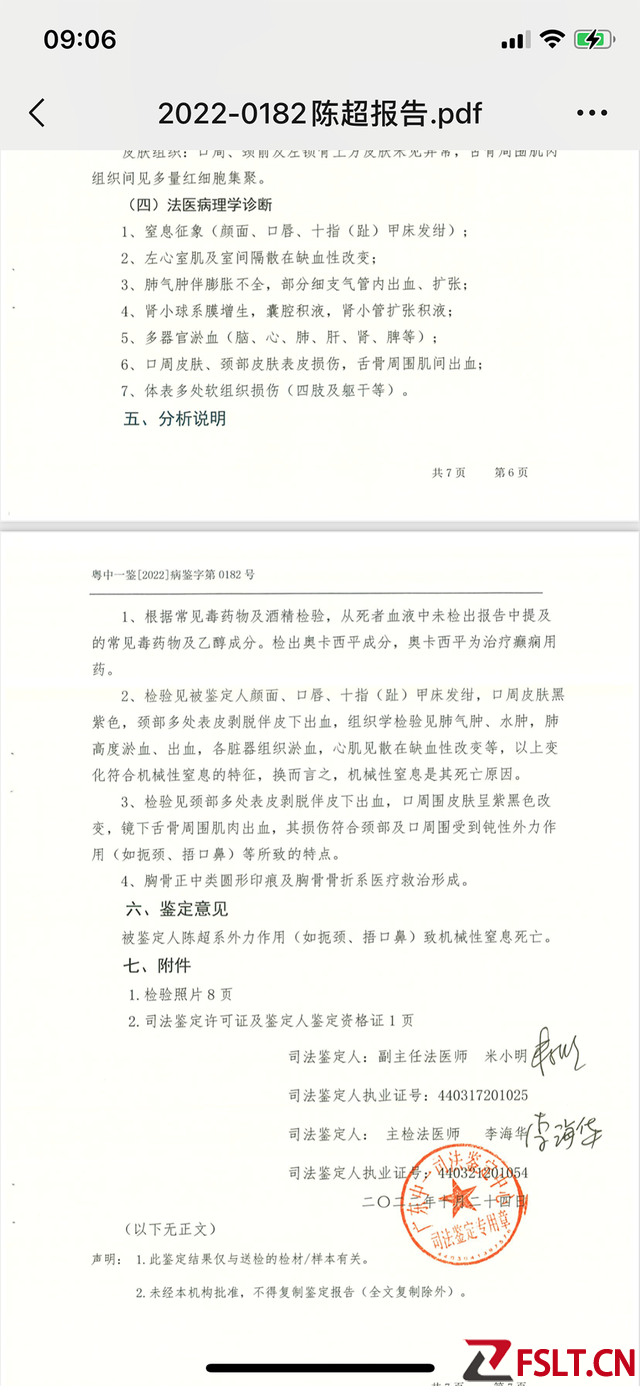 司法鉴定显示,陈超系外力作用(如扼颈、捂口鼻)致机械性窒息死亡。2022年10月,广东中一司法鉴定中心出具鉴定意见书。该鉴定意见书在“基本案情”中写道,“2022年9月6日6时30分,其(指陈超)因‘晕倒5分钟’由监区干警急救送入西江监狱医院治疗,急诊查体;患者意识丧失,呼之不应,心跳,呼吸已停止,大动脉博动消失.。经过积极抢救,6时54分罪犯陈超出现自主心跳,无自主呼吸,瞳孔有所缩小,对光反射消失。7时23分贵港市人民医院抢救,8时57分因呼吸心跳骤停(心源性?)在贵港市人民医院抢救无效死亡。”鉴定意见书显示,陈超系外力作用(如扼颈、捂口鼻)致机械性窒息死亡。