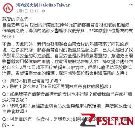 还有网友找到了海底捞在台湾省的通知,2月15日起便不再开放自带食材服务。