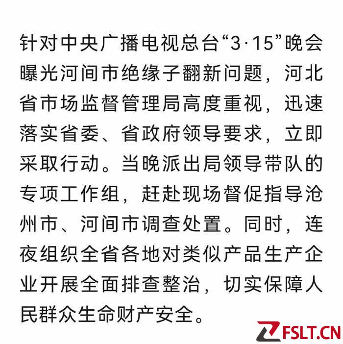 据河北市场监管官微3月16日消息,针对中央广播电视总台“3·15”晚会曝光河间市绝缘子翻新问题,河北省市场监督管理局高度重视,迅速落实省委、省政府领导要求,立即采取行动。当晚派出局领导带队的专项工作组,赶赴现场督促指导沧州市、河间市调查处置。同时,连夜组织全省各地对类似产品生产企业开展全面排查整治,切实保障人民群众生命财产安全。
